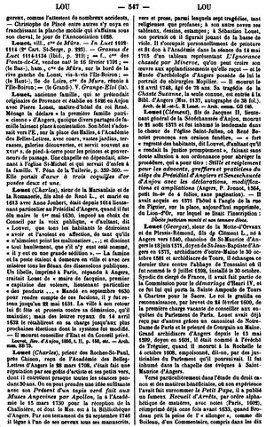 vers et prose, parmi lesquels sept tragédies, tant religieuses que profanes ; à son autre neveu ses tableaux, dessins, estampes ; à Sébastien Louet, son portrait où il figurait jouant de la basse de viole. Il s’occupait personnellement de peinture et fit don à l’Académie dans la séance du 14 mai 1715 d’un tableau représentant L’Ignorance chassée par Minerve, qu’on peut croire son œuvre aux applaudissements qu’elle reçut — et le Musée d’archéologie d’Angers possède de lui le portrait du chirurgien Mopilier. — Il mourut le 12 avril 1748, âgé de 78 ans. Sa tragédie de la Chaste Suzanne, la seule connue, est entrée à la Bibl. d’Angers (Mss. 1137, autographe de 38 fol.). Arch. de M.-et-L. Louet. — Arch. comm. GG 146.