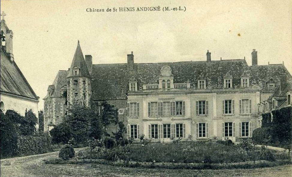 Carte postale ancienne. Le château de Saint-Hénis à Andigné (Maine-et-Loire, France), au début du XXe siècle. Édifice des XVe et XVIe siècles inscrit aux Monuments historiques (PA00108858).