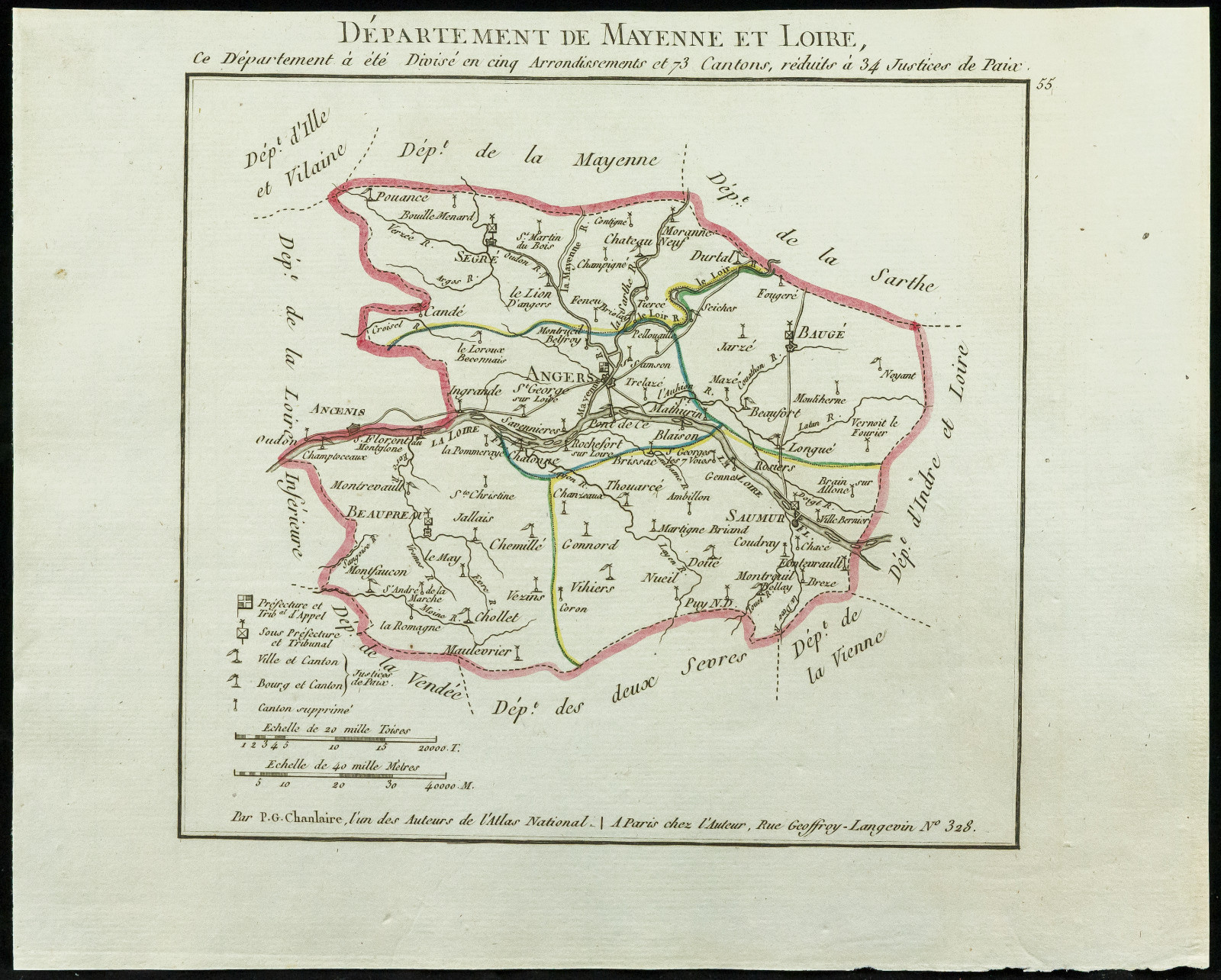 Département de Mayenne et Loire. Ce département a été divisé en cinq arrondissements et 73 cantons, réduite à 34 justices de paix. Carte par P. G. Chanlaire, l'un des auteurs de l'Atlas national, à Paris.