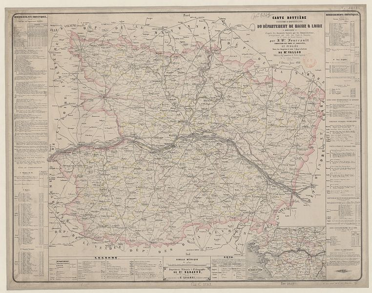 Carte routière, statistique et administrative du département de Maine-et-Loire dressée d'après les documents fournis par les Administrations, principalement par celle des Ponts-et-Chaussées et Service des Chemins Vicinaux, par Jean-Baptiste Fourcault (18..-19..), 1re édition, juin 1858, impr. E. Barassé (Angers).