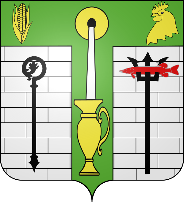 Blason de la ville de Daumeray (Maine-et-Loire, France). D'argent maçonné de sable; au chef pal de sinople chargé en chef à dextre d'un épi de maïs, à senestre d'une tête de poule arrachée le tout d'or, au point du chef d'une fontaine du même d'où coule en s'évasant un filet d'eau d'argent dans une aiguière d'or en pointe, le pal adextré d'une crosse de sable et senestré d'un trident du même sur les dents duquel est embroché un poisson de gueules.