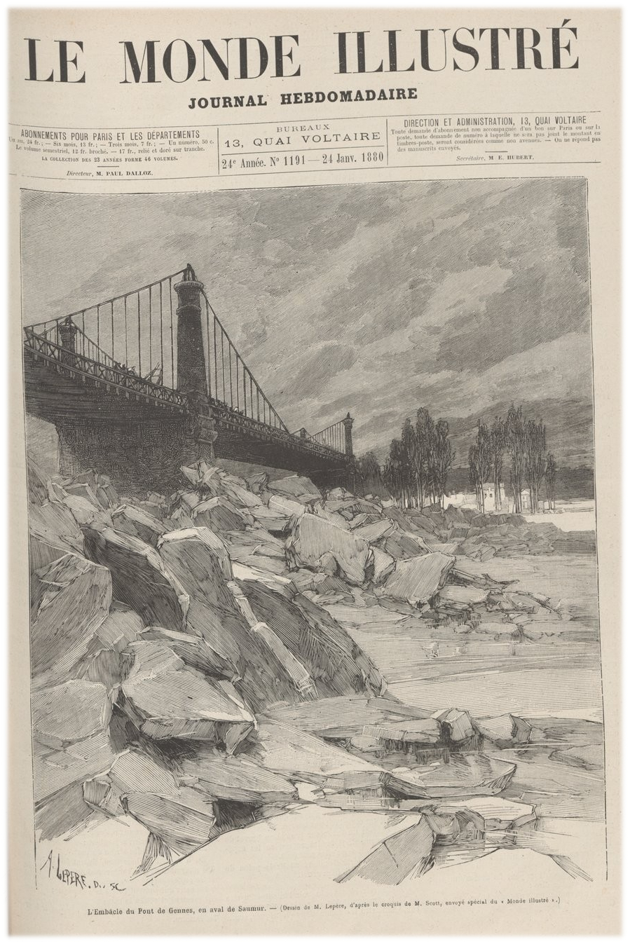 Le Monde illustré, 24e année, numéro 1191, du 24 janvier 1880, page 49. « L'embâcle du Pont de Gennes en aval de Saumur. », dessin de M. Lepère d'après le croquis de M. Scott, directeur Paul Dalloz.