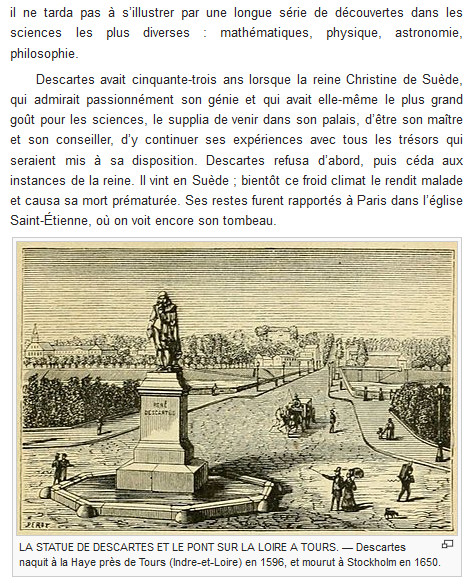 Texte : « supplia de venir dans son palais, d’être son maître et son conseiller, d’y continuer ses expériences avec tous les trésors qui seraient mis à sa disposition. Descartes refusa d’abord, puis céda aux instances de la reine. Il vint en Suède ; bientôt ce froid climat le rendit malade et causa sa mort prématurée. Ses restes furent rapportés à Paris dans l’église Saint-Étienne, où on voit encore son tombeau.