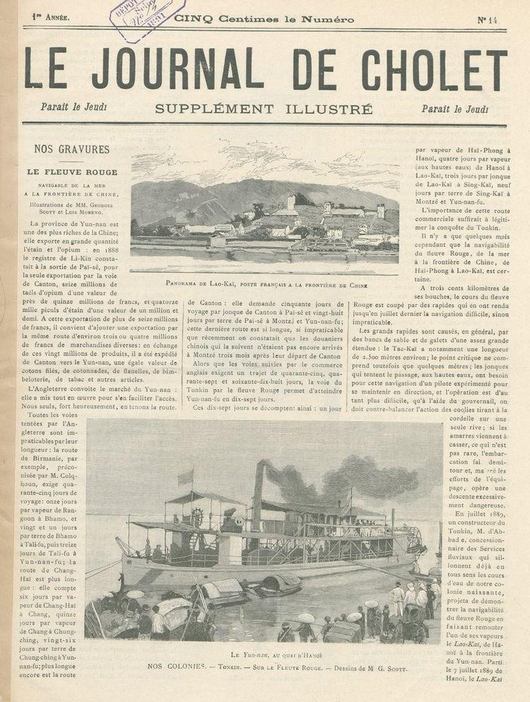 Presse locale ancienne de Maine-et-Loire. Le Journal de Cholet - Supplément illustré, hebdomadaire paraissant le jeudi, publication en série imprimée, n° 14 de l'année 1, du 5 avril 1891. Administration A. Baer, 22 rue Montpensier ; L. Lataste, gérant ; impr. P. Mouillot, 13-15 quai Voltaire à paris. Premier numéro le 4 janvier 1891 (notice BnF).