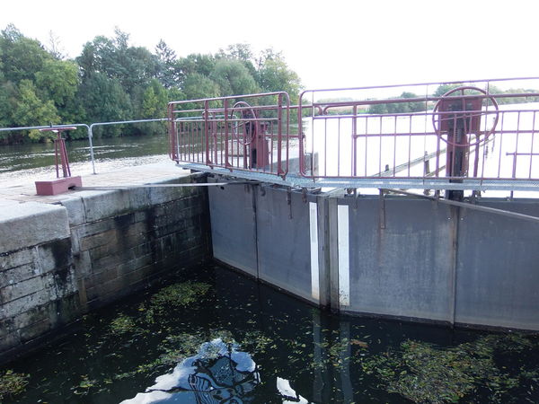 Écluse sur la Mayenne à Montreuil-sur-Maine. La rivière comprend huit barrages et écluses en Maine-et-Loire. < Voir la page Mayenne. |