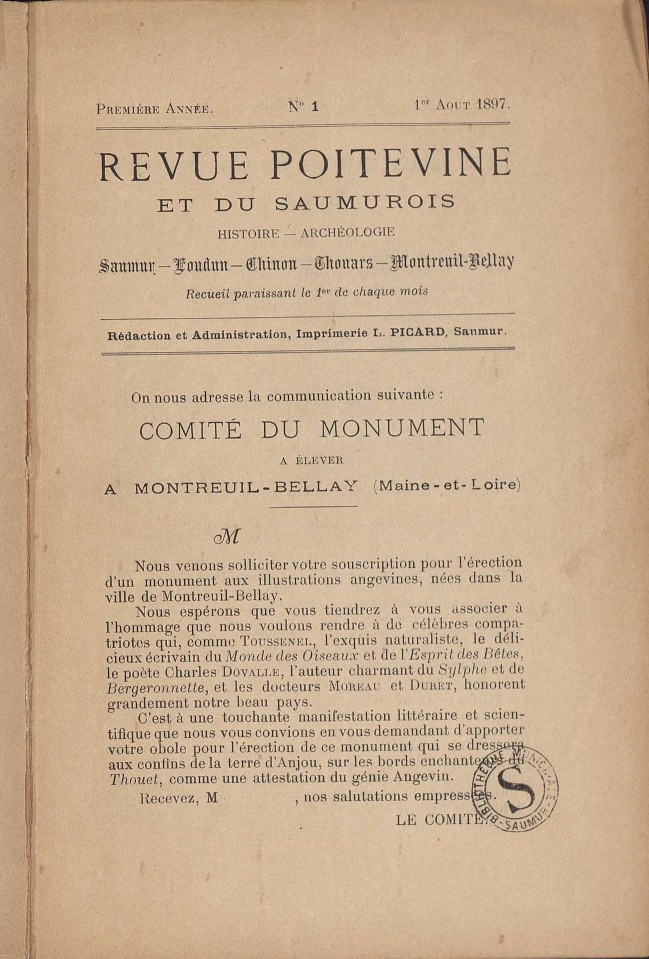 Presse locale ancienne de Maine-et-Loire. Revue poitevine et du Saumurois - Histoire archéologie - Saumur Loudun Chinon Thouars Montreuil-Bellay. Revue mensuelle, publication en série imprimée, n° 1 de l'année 1, du 1er août 1897.